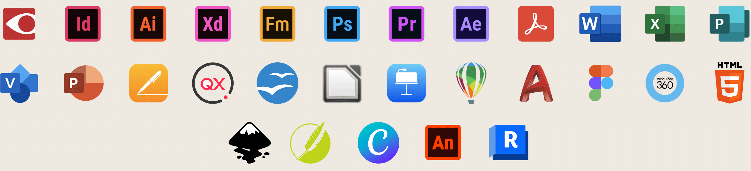 We work with a wide variety of software products including Adobe InDesign (.indd, .idml), ABBYY FineReader (.jpg, .png), Microsoft Word (.docx), Microsoft PowerPoint (.pptx), Adobe FrameMaker (.mif, .fm), AutoCAD (.dwg, .dxf), Adobe Illustrator (.eps, .ai), Adobe Photoshop (.psd), Microsoft Excel (.xlsx), Microsoft Visio (.vsdx), Microsoft Publisher (.pub), Articulate Storyline 360 (.story), OpenOffice (.odt), LibreOffice (.odt), Adobe Acrobat (.pdf), Adobe After Effects (.aep), Adobe Premiere Pro (.ppj), Adobe XD (.xd), CorelDRAW (.cdr), Figma (.fig), Keynote (.key), Pages (.pages), QuarkXPress (.qxp), HTML (.htm, .html), Inkscape (.svg), Canva, MadCap Flare (.flprj), Adobe Animate (.fla), Autodesk Revit (.rvt).